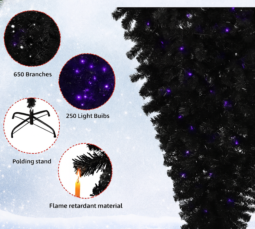 This 6 FT upside down Christmas tree combines Halloween spookiness and holiday cheer. Black PVC branches, 250 purple LED lights, pumpkin & skull ornaments, and 8 lighting modes make it a bold centerpiece. Flame-retardant, durable, and space-saving with sturdy metal stand. Perfect for living rooms, entryways, or offices.